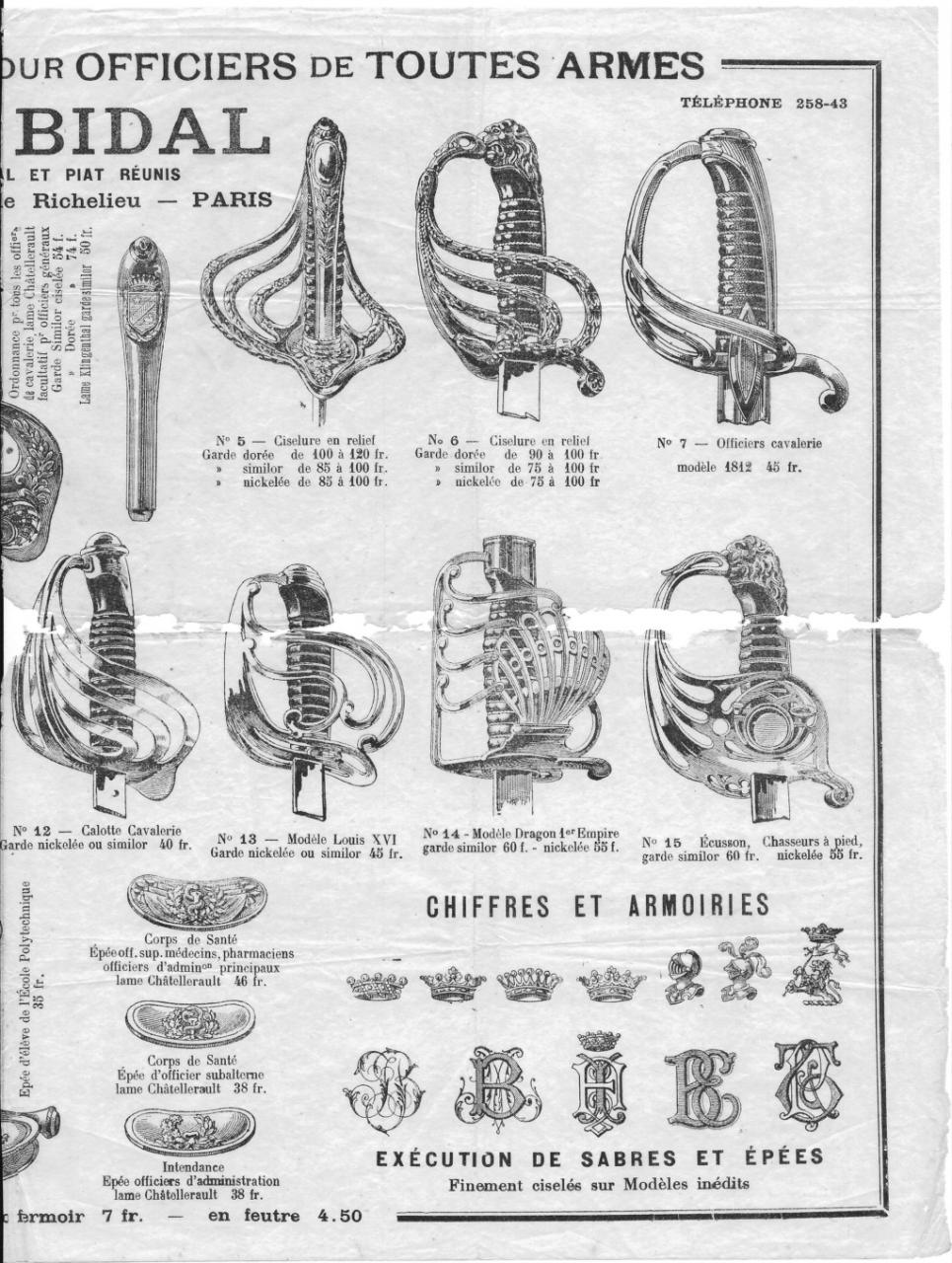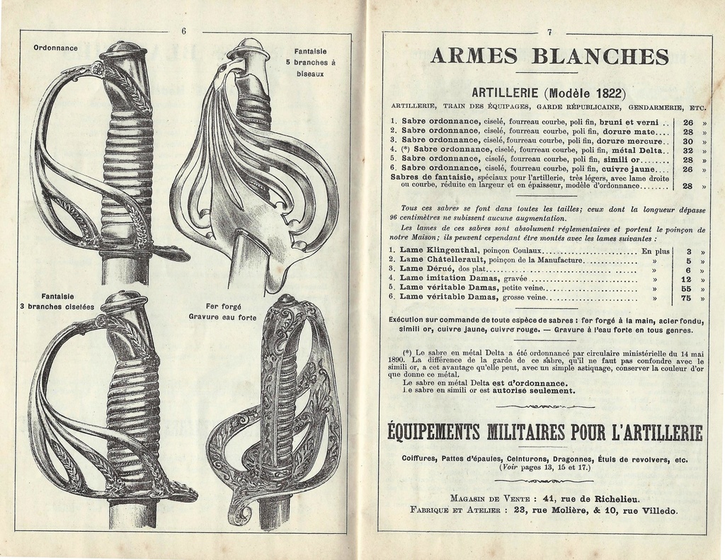 As said earlier, both myself and Mr. Jean Ondry believe there is a solid chance this is a composite, albeit an older composite. The blade is form correct though. Large guards like this were offered even into the 20th century though it seems weird that no examples pop up elsewhere. As an aside, it has me wondering in a regrettable way if many swords purported to be older than they are, such as belonging to the Napoleonic Wars era, are actually later creations and either through ignorance or outright malice, have all been slowly shifted towards an earlier provenance? After 4-8+ owners over a century or more, or sold by a relative or an antique dealer, it would only take a single person to misattribute the sword to an earlier era to make it largely permanent, and you would need to look at all of them with a deliberate focus of trying to prove they are not as old. I cannot speak any French and I do not wish to disturb the waters over on Passion-Militaria enough or even in France proper to ever make any public statements. There is, however, a fascinating world of custom and non regulation swords over there that is waiting to one day be uncovered and categorized more, just by looking at hilts. Last images are of various catalogs in the last decades of the 19th and early 20th century (image #4 is another unused guard I got that was unfinished, has what appear to be guide lines for some fleur-de-lys type of later chiseling, but has again appeared to be a complete mystery for provenance as it does not match hilts seen anywhere. I have a Swedish 1773 cavalry pallasch blade and should I ever find someone who can, I would love to have the hilt decorated and filled out with maybe a central elaborate plate mounted of some sort even just for a personal design, the tongue of this one is quite wide and long at the top so unless it was overcast and meant to be filed later, whatever pommel or backstrap it was to slot into was quite large)