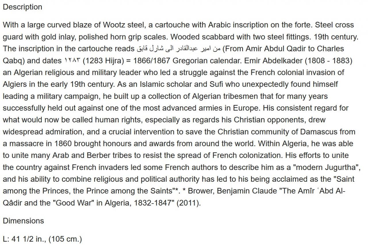 The knife : I dont think it is actually the one attributed to the emir. You right that this one isn't algerian... but... A LOT was also made in algeria, a point I've developped in my book (already too much talk about that book hahah.. But very close to share it with you all !! Inshallah ). Those are a bit different, no niello on hilt, no filigree work on the scabbard, only repoussé on both, with usually a floral decorativ scheme. Rarely those round maker marks. A lot of them are engraved with a mention that precise the algerian origin, but actully very few people noticed that.