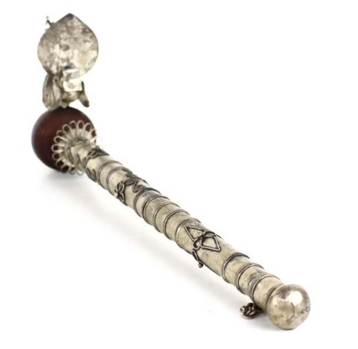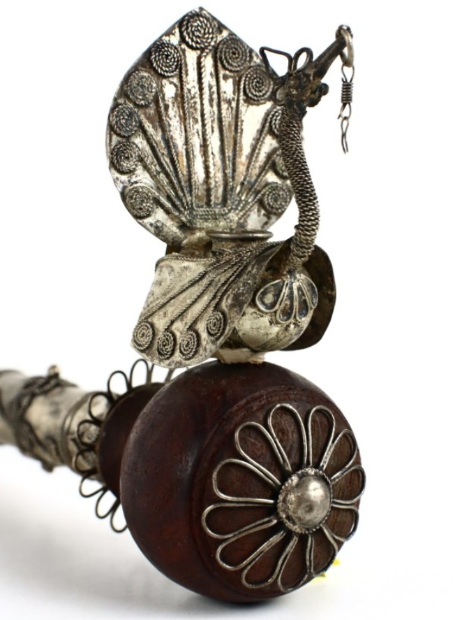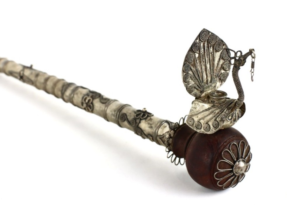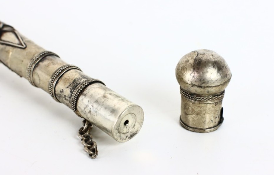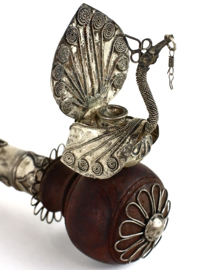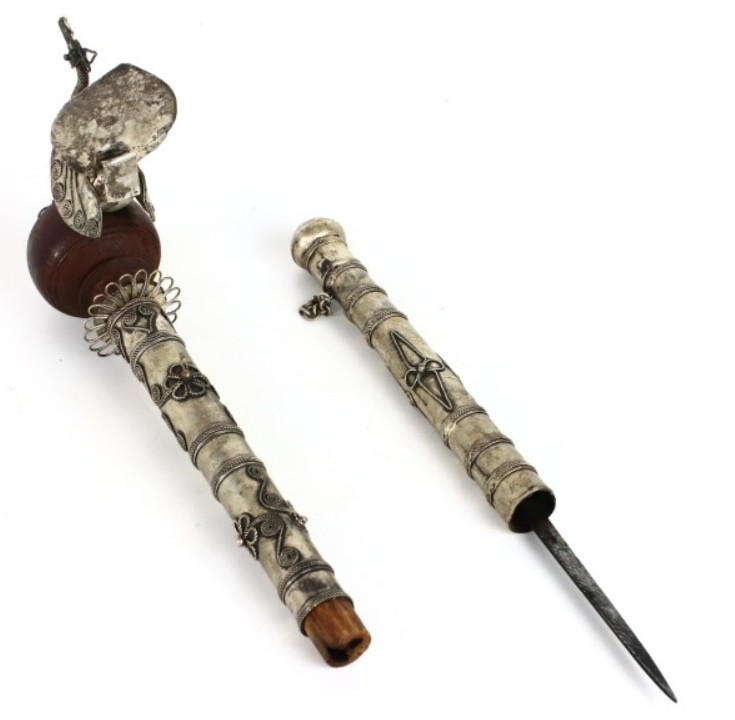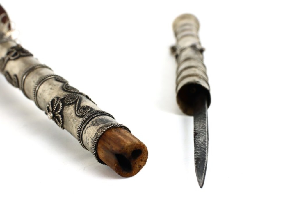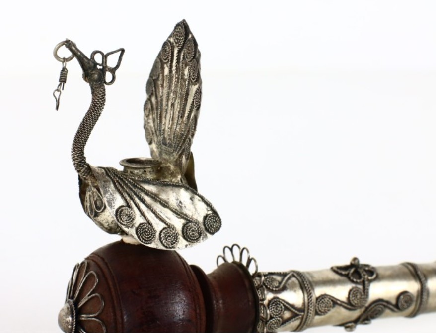 Antique Asian Paktong pipe with a peacock and hidden knife from around 1900, handmade filigree and engraved decoration.
