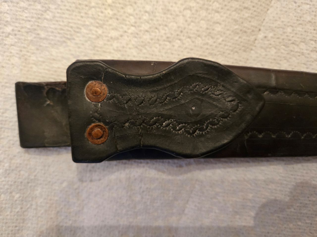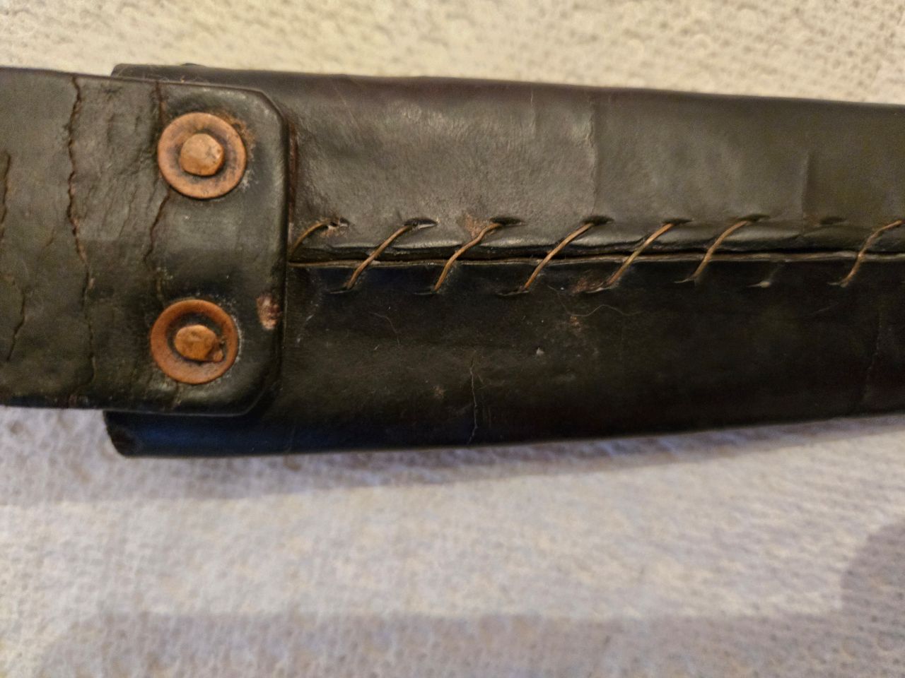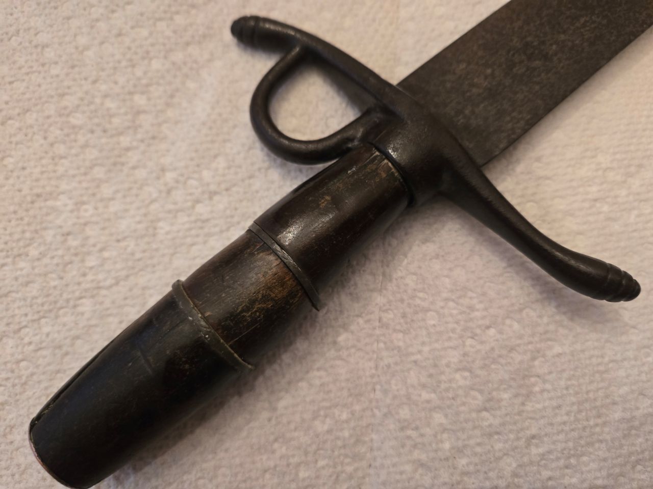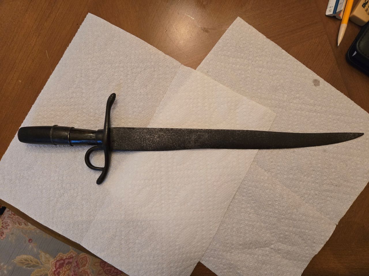 Hello again. Recent short sword purchase from estate sale via online auction here in Baltimore, MD. 18.5" overall with 13.5" blade. Assume Revolutionary War era due to the "homemade" simplicity and chunkiness of the hilt and lack of decoration other than simple scribed quillions. But maybe that is not correct? Cross guard and quillions are iron. Wooden handle with intermediate metal "washers" and simple copper cap. Blade style has that slight dip to it in middle. Has a letter "C' marked on blade with a barb (like a fish hook?) at top of the C. Wondering if anyone has seen this mark before? Also curious about the big finger ring/loop which is under the hilt. Is that an unusual location or size for it? (actually feels pretty comfortable to hold with finger thru it...plenty of room). Haven't seen anything similar to that ring in the Rev. period reference books I have. Maybe this is just a blacksmith one-off? Also came with a leather hilt with copper rivets, simple decorative stamping on one side, copper wire stitching on the other. Any thoughts on this one would be greatly appreciated!