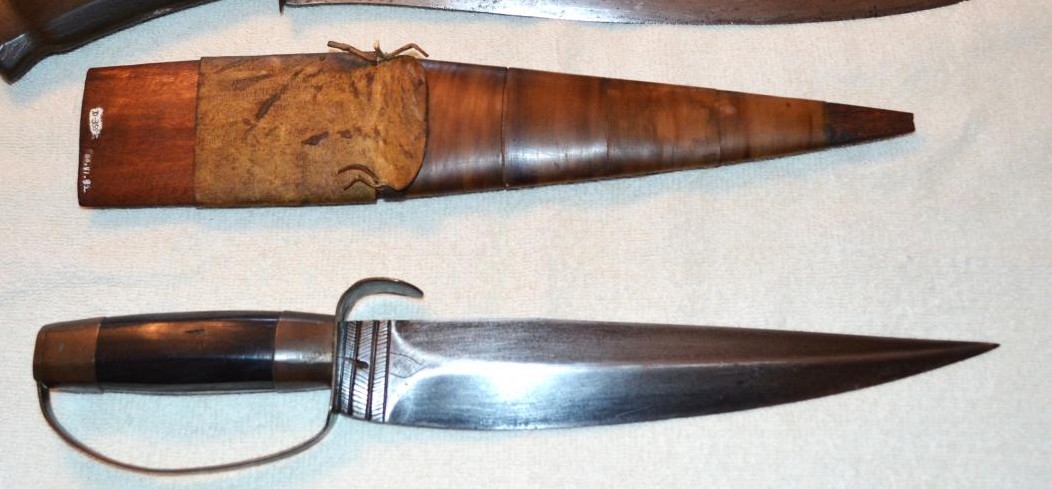 Two nice Luzon knives with some age I believe. The smaller one with the triangular blade plus D-guard with down-turned quillion has Spanish colonial features. I think this one was locally made in Luzon (the full tang hilt and Spanish colonial features suggest Luzon rather than Visayas) and perhaps from the Batangas/Lake Taal area to the south of Manila. The lines and cross-hatching are features I've seen on other Batangas/L-T knives. This one could be late 19th C in manufacture. The longer one has not been cut down in my opinion. The shape of this blade is commonly found in Northern Luzon (Ilokos) as well as Central Luzon (Pampanga) and other Tagalog areas. The Visayan scabbard appears misplaced for this knife. Hard to judge the age of this one. Perhaps WWII-era or a little earlier. Regards, Ian. Last edited by Ian; Today at 04:16 PM. Reason: Spelling |