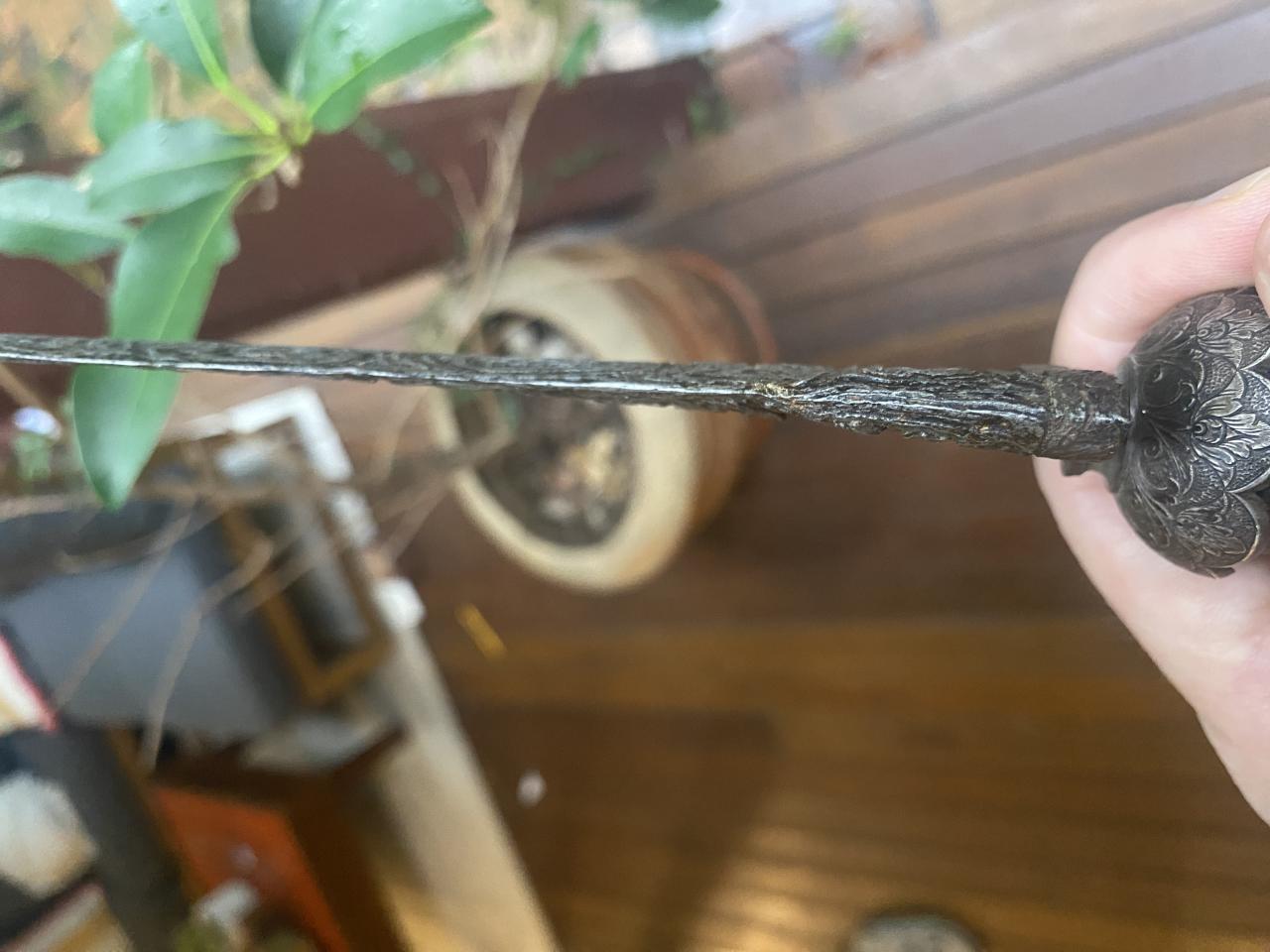 To my eye the entire hilt looks like it has been soaked in very strong tea, or maybe even coffee, & then given a good rubbing with coconut husk. Blade core I very much doubt that this is a recent decorative blade, OK, I'm basing my opinion on photos, but from those photos my impression is that this is not of recent manufacture. I feel that the gonjo could well be later than the body of the blade. Rather than referring to a "blade core", it might be more correct to refer to a "cutting edge". Some older blades, I think probably most that I have seen would be around the Second Mataram era, do have an inserted cutting edge. There are several ways of producing a pamor blade with an inserted edge, but what happens as the blade ages is that with continued cleaning & maintenance that inserted edge erodes and we see the cutting edge disappear. When I remarked that we need to see both edges at the same time, this is not possible to do in a photo, I do not mean that we look at the blade edge on, what we do is to turn the blade slightly, from side to side & continue to focus on just that section of the blade where we see the separation of cutting edge from pamor layer, we can then perhaps see a similar separation, or at least a defining line, between cutting edge & pamor layer on both sides of the blade in the same section of the blade. Esoterica It is believed by some people that this particular pamor can have an adverse effect upon the possessor if that person is not strong enough to withstand the esoteric influence of the powers contained in the blade. However, many other people believe that it has strong defensive power to protect against black magic. It is a fairly widespread belief that it is definitely not a pamor that is suited to everybody, & you don't really know if it is suited to you or not until the sh*t hits the fan, so its best to stay away from it. It is a relatively easy pamor to produce. As for being "sought after", well a lot of collectors are rather partial to this pamor, I myself am pretty found of it & have a very old, very good example, but most keris literate, traditional Javanese people tend to avoid this pamor. |