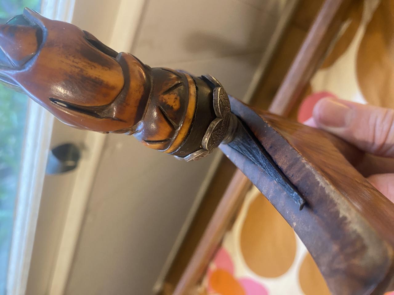 Obviously Malay dress (sheath not that old, I think); old ivory Jawa demam hilt (inset eyes missing). Old Malay hilt cup. Blade is slender and dainty and looks to me like the Javanese pamor lawe saukel; overall seems like a Javanese product. Blade is old, but has been well-fitted to the Malay-type sheath. I would be grateful if anyone is willing to share their opinion on this one. Cheers |