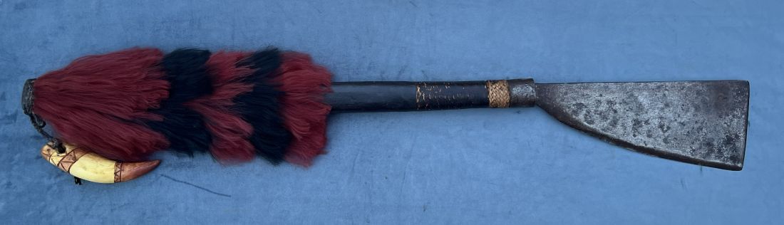 The axe seems likely to originate with the Konyak Naga based on the information I have. The shape of the blade is indicative as is the red and black hair. The ancestor figure carving I have not seen before nor is it mentioned in the references I have. It reminds me of carvings by the Paiwan (Taiwan aboriginals) on their weapons.