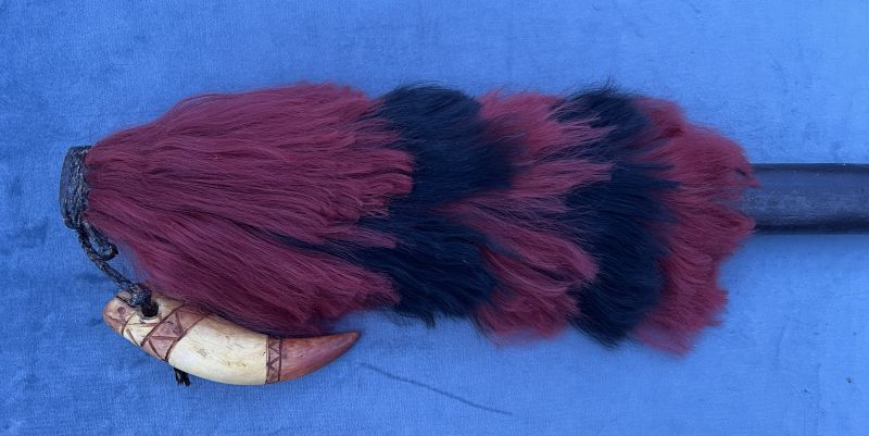THE DESIGN ON THE BLADE OF THE CURVED KNIFE DOSEN'T LOOK NAGA TO ME OTHER THAN THAT I CAN'T SAY, PERHAPS SOMEONE WILL RECOGNIZE IT. THE CARVED FACE ON THE DAO HANDLE IS SOMETHING I HAVE NOT SEEN ON NAGA ITEMS BEFORE BUT IS A DECORATION CONSISTANT WITH HEADHUNTING SOCIETYS (I LIKE IT). WE CAN ONLY GUESS IF IT WAS CARVED AND PERSONALIZED BY THE OWNER OR ADDED TO MAKE THE ITEM EASIER TO SELL. THE HEAD EITHER REPRESENTS A ANCESTOR OR A FRESHLY TAKEN HEAD. IF IT WERE A SKULL THE EYES WOULD NO DOUBT BE ROUND. HEADS OFTEN ARE REPRESENTED IN THE ART OF TRIBES THAT PRACTICED HEADHUNTING BUT THE DESIGN WAS NO DOUBT RESTRICTED BY TRIBAL TRADITIONS AND TABOOS AS TO WHERE AND WHEN IT COULD BE USED. IN MORE RECENT TIMES THE TRIBAL LIFE AND ITS TABOOS AND TRADITIONS HAVE NO DOUBT CHANGED ESPECIALLY NOW THAT HEADHUNTING IS NO LONGER PRACTICED. I HAVE OFTEN WONDERED ABOUT THE FANCY HAIRY NAGA SPEARS. THE HAIR NEAR THE POINT WOULD SERVE TO KEEP BLOOD FROM MAKING THE ENTIRE SHAFT SLICK. THE OTHER SECTION LIMITS THE GRIP AND MAKES IT SUITABLE FOR A SHORT THRUSTING SPEAR FUNCTIONING LIKE THE ZULU SPEAR. SLIDEING TECKNIQUES AS USED IN CHINESE AND OTHER SPEAR FIGHTING TECKNIQUES WOULD BE ELIMINATED. THE HAIR WOULD ALSO MAKE IT A VERY POOR THROWING SPEAR. PERHAPS THERE ARE FILMS OF THE NAGA STYLE OF SPEAR FIGHTING TECKNIQUES.? THE SHORT SPEAR WITH THE BAMBOO HANDLE AND THE SPEAR WITH ONLY HAIR NEAR THE BLADE AND THE STEEL BUTT SPIKE COULD BE USED MORE FREELY. THE USE, TRIM AND COLORS OF THE HAIR DOES MAKE THE NAGA SPEAR ONE OF THE MOST BEAUTIFUL OF SPEARS.