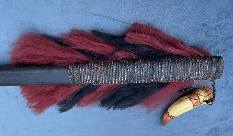 . What is the cap on the butt made of? To me the leather wrap looks like an addition to cover up the holes in the in the wood that once had hair tassles glued in. The horn thing made of? also a latter addition? not native? If it were mine I would probably remove the additions. Then you have a nice original piece just lost the hair which is common.