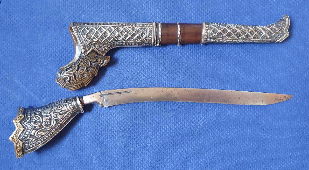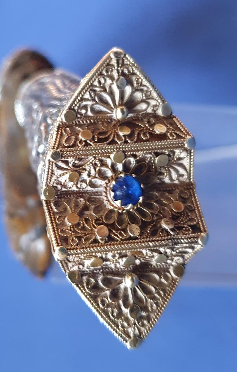 Yesterday evening I cleaned the blade of this little fellow. On top of the handle is a gold cap, very finely worked, in the middle a blue (glass?) stone, a brown horn scabbard mouth, silver fittings. 24,7 cm inside scabbard, 22,5 cm without, blade without bolster 16 cm. Possible Minang.