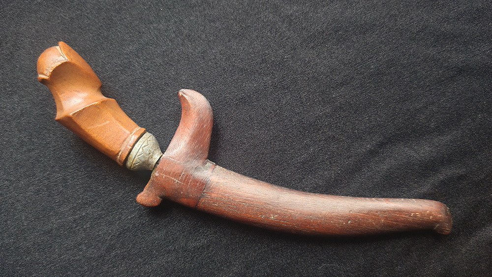 There we are again by the name game! I haven't given it a name, I just wrote that I would place it to the kerambit family, you said with other words the same. It's just my feeling that someone in the Palembang area has created a personal dagger for self defense. It's a unique piece for sure, like you I never have seen a similar piece before! How it can be used is difficult to say without handling it in person. And I wouldn't mind to add it to my collection! Regards, Detlef |