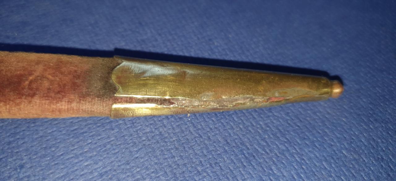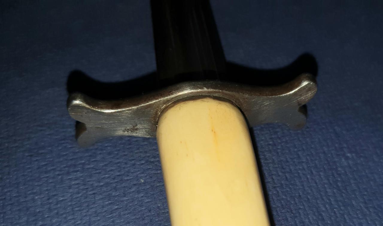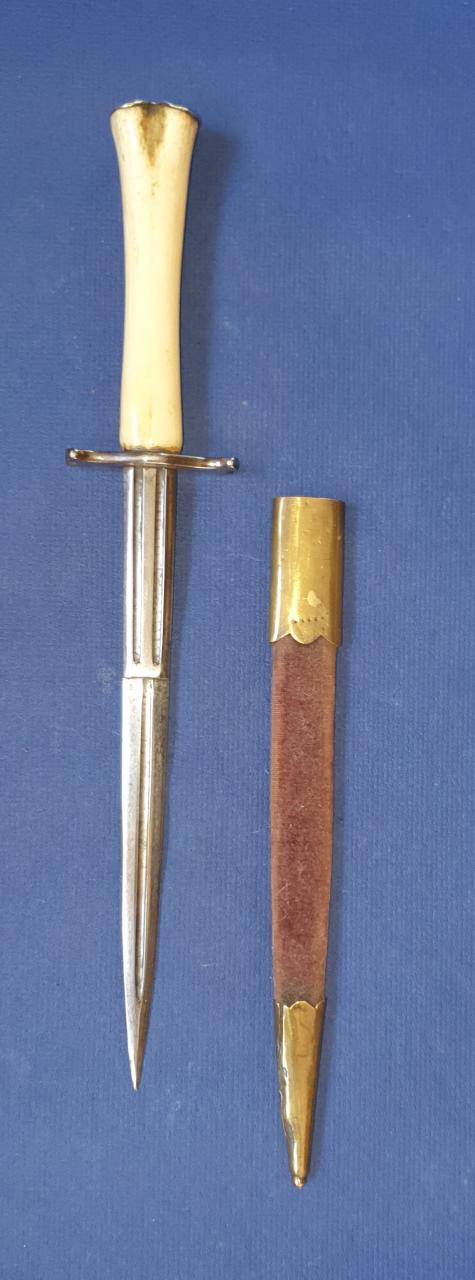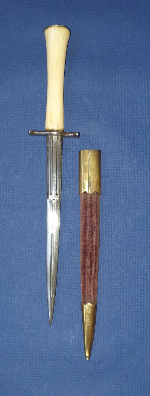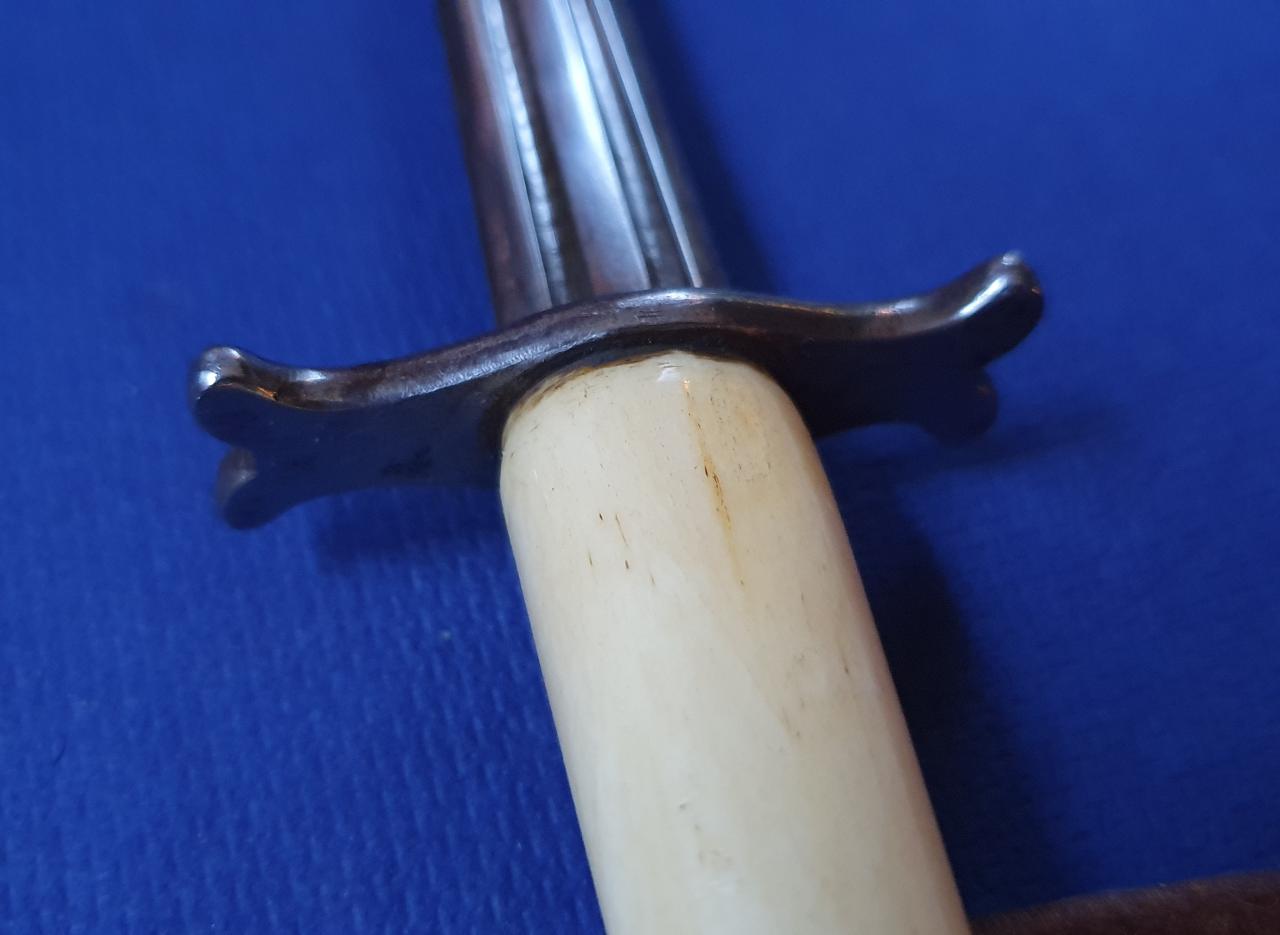 I offer my possible French hunting (?) dagger for sale. Bone (deer?) handle with engraved (F.J.) silver cup. Iron guard and a very nice blade with an acute tip. Wooden scabbard with brass mounts and velvet cover, the brass foot is opened.