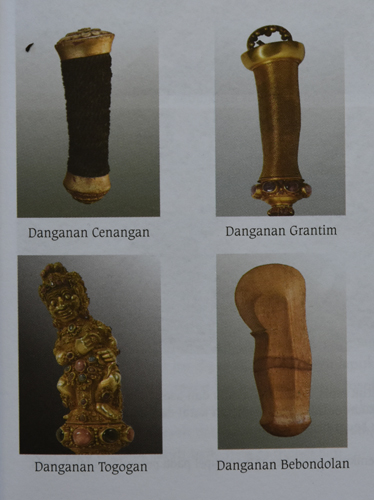Let's take a look on non-figural Balinese Keris hilts in that book. About the form with gold wire braiding between Selut with stones and an end piece with Liking Paku figurine, he writes - it is called Loceng (which is Loncengan), in North Bali called Grantim (Gerantiman). If such hilt (in North Bali) has a plain Selut (apparently still with braiding), it is called Loceng (Loncengan). If such hilt, with Selut and Liking Paku finial, appears with plain wooden body, without braiding, it is called Telaga Ngembeng. After a couple of paragraphs he calls exactly the same hilt form Tapuk (Tapukan).