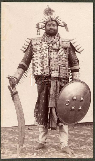 Notable (and seen on both examples) is the hook, which rather than being a potential 'weapon' such as the spike and knife, would be perhaps thought of to snag or grab something, i.e. a weapon? This notion , while often suggested toward weapons features for such purposes, has not as far as I know, has not been proven viably. Indian arms makers have it seems always been innovative, and the creation of combination arms has long been notably in place, it seems often to impress more often than to be effective in actual combat. Obviously not to say these features could not have been effective, however, in most cases, likely arms of this character were more for visual effect in certain events in the manner of gatherings of court notables etc. The British 'Imperial durbars' were the formal examples of these kinds of gatherings (1877, 1903 and 1911) and these brought the armorers of various regions to show their wares and these kinds of examples among others brought notable attention. I think of the curious warrior of India looking quite terrifying with huge sword and adorned with spiked armor (uncertain where the image posted is from but seemed interesting as example). My interest in this shield is very piqued! and I hope there will be more discussion......I am anxious to get to my books! ![]() Thank you again Osca! .........hope we can pursue further! |