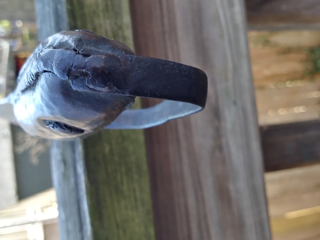 I had taken close-up pictures of the hilt, trying to determine whether the blade had been modified, perhaps from the "boomerang" shape, prior to having a hilt affixed, but I'm unable to decide. The hilted area does seem rather thicker that the blade area, but it seems too speculative to say more.