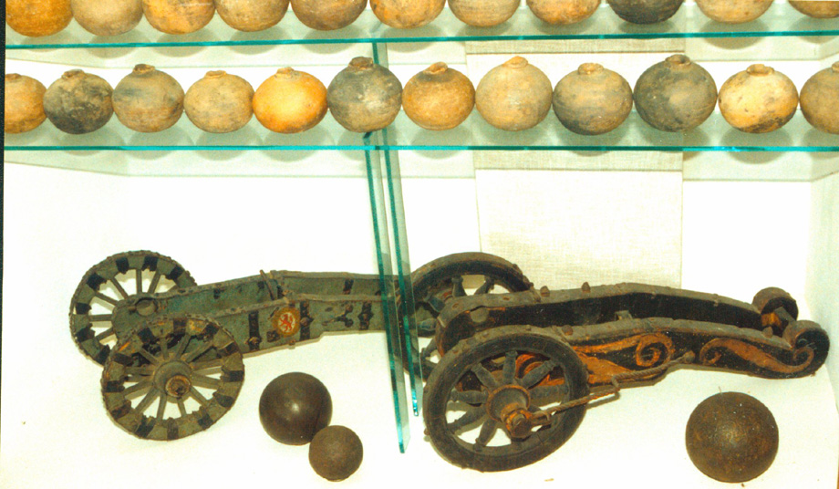 A huge iron throwing ball for a catapult above and a pair of mid 16th century miniature cannon below. Michael |