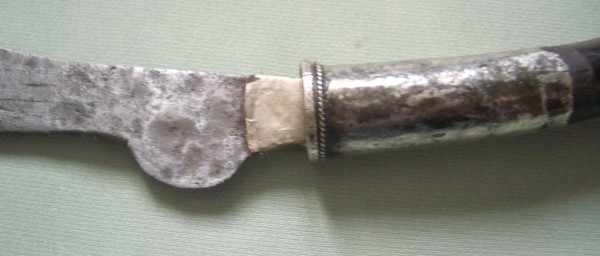 This last one is quite amazing. It is a goat(?) horn to which the blade has been fixed. The sharp edge is on the exterior, at the base of the blade is en enlargement to allow the thumb positioning. Nicely decorated with silver. A rice cutting tool ?