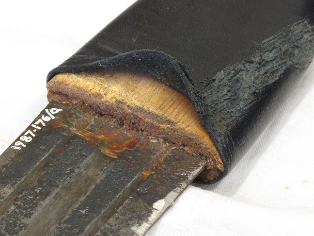 In any event, we've got four of these beasts, and they seem to match the typical profile of a kaskara from my own research. Long, double-edged blade, designed for a one-handed grip, one or three fullers, and to be honest, fairly crude-looking construction. All but one are without their scabbards, and this example's scabbard is less than half intact; given the damage it's sustained over the years, I'd surmise that even if the others once had their scabbards, they have long fallen victim to time, neglect and abuse. This particular blade is also, sadly, the worst of the lot; as well as substantial chips in its edge, the flats of the blade are badly pitted. When I removed its scabbard, in March, I found that the blade was still rusting slowly away, and immediately began trying to remedy this; so far I've been using 0000 grade steel wool and Young's "303" gun oil, with a coating of 3-in-1 to try to protect the blade from further moisture, but I'm checking regularly for activity. Advice on this matter would, as always, be very helpful. The blade is, overall, some 34.125in (86.5cm, give or take), from the tip to the lowermost edge of the cross guard, which is of course cruciform in shape; its width varies from 1.25in (3.5cm) near the tip, to just shy of 1.7in (4.4cm) a quarter of an inch forward of the ricasso, which tapers by 0.1in toward the cross guard, presumably to accommodate said part and the grip. At a guess - for I've not had the nerve to remove the remaining sections of the grip - the blade's length, including tang, is probably around 39.5-40in (100-102cm, again give or take). The blade exhibits pitting, extensive inactive rust, and several chips along its edge - possibly battle damage, or possibly due to careless handling, I'm sorry to admit. There was also significant active rust on the lower 21in (52cm) of the blade, which had probably remained covered by the scabbard for some time. It exhibits three fullers, the outer two extending a little less than 11.4in (29cm) from the cross guard, while the innermost runs some 17.25in (43cm) down the blade. To either side of this central fuller sits what appears to be a depiction of a crescent moon, but with an unusually jagged "cut" to its crescent; it may be Arabic text, or perhaps a depiction of something else entirely (sunrise over mountains?). The grip is in poor condition; denuded of its binding material and the leather (?) pommel present on our other three kaskara, all that remains is its wooden core and some coils of what seems to be steel or iron wire. This wire is terrible corroded and very brittle; a piece around 1/4 of an inch in length snapped off in my fingers when I attempted to unwind it. It is deteriorating and will probably do so until it has simply disintegrated; at this stage I can see no means to stabilise what is obviously almost totally destroyed metal. The grip's core has a single nail through it, which presumably passes through a hole in the tang in the manner of the Japanese mekugi/mekugi-ana method. The scabbard is, likewise, in poor condition; 22.5in (57.2cm) in length, it is obviously missing a foot of its length, perhaps more - or am I wrong, and do kaskara scabbards (if this even is a kaskara - argh!) not extend so far as those found elsewhere? In any case, whatever lay above that 22.5in mark has been torn away, judging from the jagged edges of the damaged portion. The tip of the blade has ripped through the very tip of the scabbard, with the result that it now protrudes by around 1/3 of an inch, and the scabbard's stitching is failing badly on the reverse side. I have no idea how long it has been left without leather treatment of some sort, but any help in mitigating the damage would be most appreciated. And now, pictures! Weapon in scabbard: http://img576.imageshack.us/img576/4185/img0389gl.jpg And out of scabbard, with this alongside: http://img22.imageshack.us/img22/8172/img0372he.jpg Blade details, obverse: http://img38.imageshack.us/img38/6236/img0378ws.jpg http://img571.imageshack.us/img571/500/img0379a.jpg http://img217.imageshack.us/img217/9711/img0380w.jpg http://img36.imageshack.us/img36/3628/img0388sc.jpg Blade details, reverse: http://img412.imageshack.us/img412/9725/img0382u.jpg http://img201.imageshack.us/img201/9394/img0383y.jpg Grip, cross guard and wire: http://img718.imageshack.us/img718/1305/img0381ek.jpg http://img522.imageshack.us/img522/8186/img0384cu.jpg http://img15.imageshack.us/img15/5012/img0393ax.jpg Scabbard, obverse: http://img43.imageshack.us/img43/1089/img0373el.jpg http://img156.imageshack.us/img156/750/img0374o.jpg http://img263.imageshack.us/img263/5611/img0377ao.jpg http://img21.imageshack.us/img21/5930/img0375hl.jpg http://img341.imageshack.us/img341/6500/img0376q.jpg Obverse, with sword inside: http://img80.imageshack.us/img80/6521/img0391r.jpg Obverse, damage to scabbard tip: http://img375.imageshack.us/img375/1773/img0390.jpg Reverse, damage to scabbard tip: http://img199.imageshack.us/img199/9353/img0392bg.jpg View down scabbard: http://img28.imageshack.us/img28/2976/img0387uz.jpg |