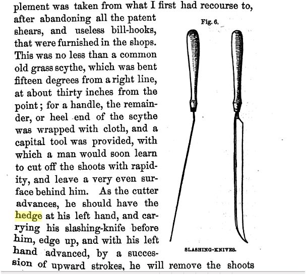 Loudon also shows a long handled 'scimitar', a thin sword like tool used for dressing the faces of hedges, and Blakie mentions a 'slashing knife'...