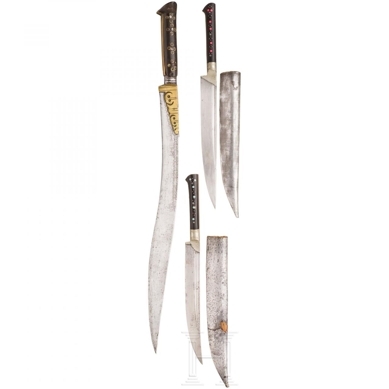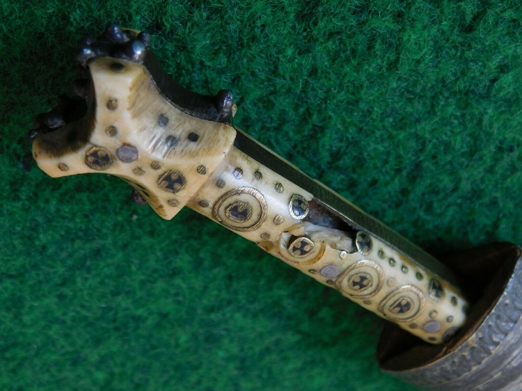 Here is a nice puppy I got a little while back. It is a bichaq from Sarajevo with green dyed bone and inserted brass pieces. This type of coloration and inserts are usually found on the stocks of Ottoman rifles. The blade is laminated with a maker's mark in the form of a shamshir. I made the brass scabbard based on those that went with such pieces. This is my first metal wrapped scabbard I ever made. I believe this piece is mid-19th century. I have seen very few of these in green bone. Most are white bone with inserts.