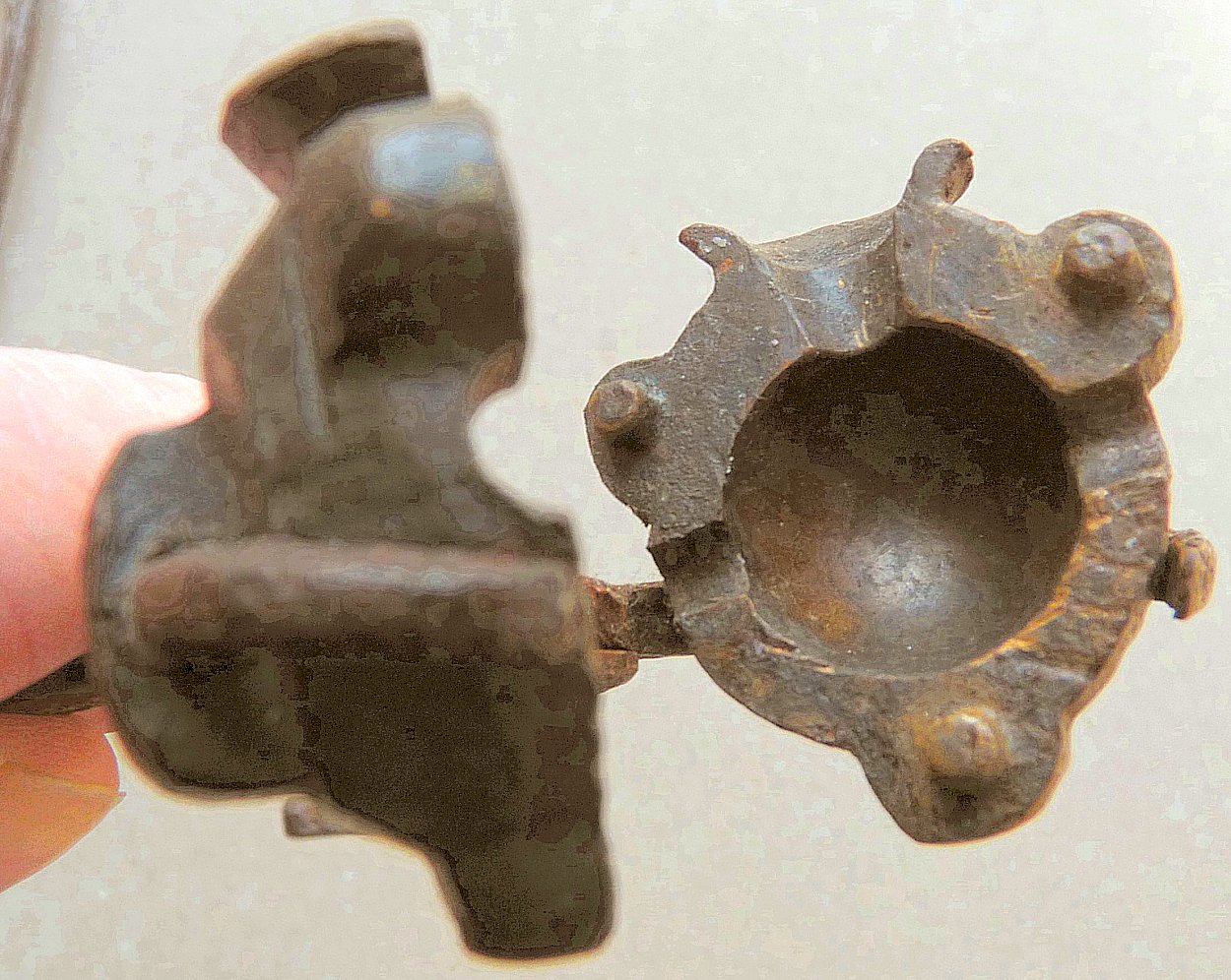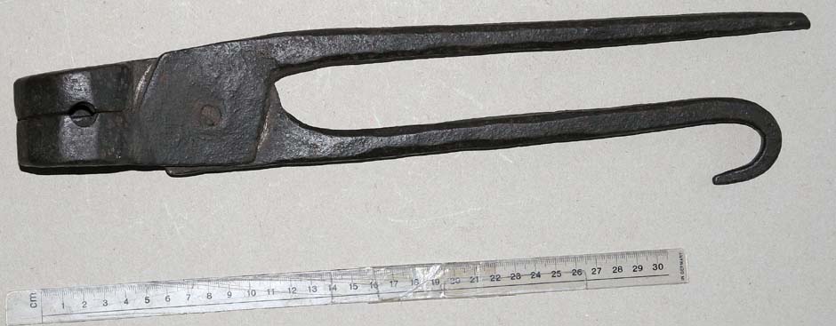 I wish to present a few items from my collection, togehter with others. The earliest molds in the 14th/15th centuries seem to have been bipartite forms made of stone. The oldest source of illustration, dated 1411, depicts one part of a multi hole mold (Cod.Vind. 3069, Austrian State Library) and some original pieces have been excavated at Hochkönigsburg in Alsace-Lorraine at a castle site. We may safely assume that in the course of the 15th century, molds cast of copper alloy began replacing those made of stone. I is true that we do not have any sources of illustration before the early 16th century but there are various finds known. I attach a few pics. Most of them have loops denoting that they were originally equipped with iron handles for convenience. The next stage, with earliest illustrative records extant from the 1460's, is a funnel shaped casting device consisting of two halves each joined to an iron handle. There seems to be only one actual piece known and this is in my collection; the mold is of relatively thin hammered copper alloy with robust joints to the handles. For this specimen I should tentatively postulate a date of ca. 1500. All the molds mentioned so far are for relatively small caliber balls, ca. 12 to 16 mm, correspondig to the average early harquebus calibers. What, however, about molds for larger pieces like wall guns and haquebuts? Of course they must have existed since an early stage, as well as those huge guys for casting the iron balls for the bigger artillery pieces. I can only bring forward one single sample of a late 15th/early 16th century wrought iron mold for casting balls for wall pieces and haquebuts. It is of impressive dimensions and shows the same roughly hammered surface as most iron haquebut barrels do. Its weight is almost 2 kg and its caliber 31 mm. There also stylistic reasons for dating this mould: one of the handles of a pair of pliers in the Maximilian Arsenal Books of ca. 1507, as well as the trigger of a beautiful Late Gothic crossbow in the collection of a friend of mine, show the same curved back form as my mould does. Of the same period is a fine copper alloy cast multiple mold for ten balls of 24.5 mm each, the average caliber of a haquebut barrel; also the general form of that mould reminds me of the rear end of a copper alloy, vulgo 'bronze', haquebut barrel. It retains its polished wooden grips. Last in line for today, the small wrought iron mold for balls of 13 mm diameter with some sparce Early Renaissance decoration reflects the style of the first half to mid 16th century. It is preserved in unusually crisp condition thoughout. Michael Last edited by Matchlock; 9th June 2009 at 07:05 PM. |