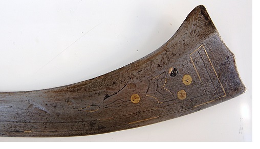 Here is the blade of an Algerian Nimcha...with the bite marks (hogs back eyelash marks) from what is generally agreed as Genoan origin. (Penciled in the margin; "It may be said that the Algerian and Moroccan Nimcha were very similar and though I have seen elaborate hilts on Algerian including clossonne/enamel and in this case tortoise shell the two forms are virtually identical.)