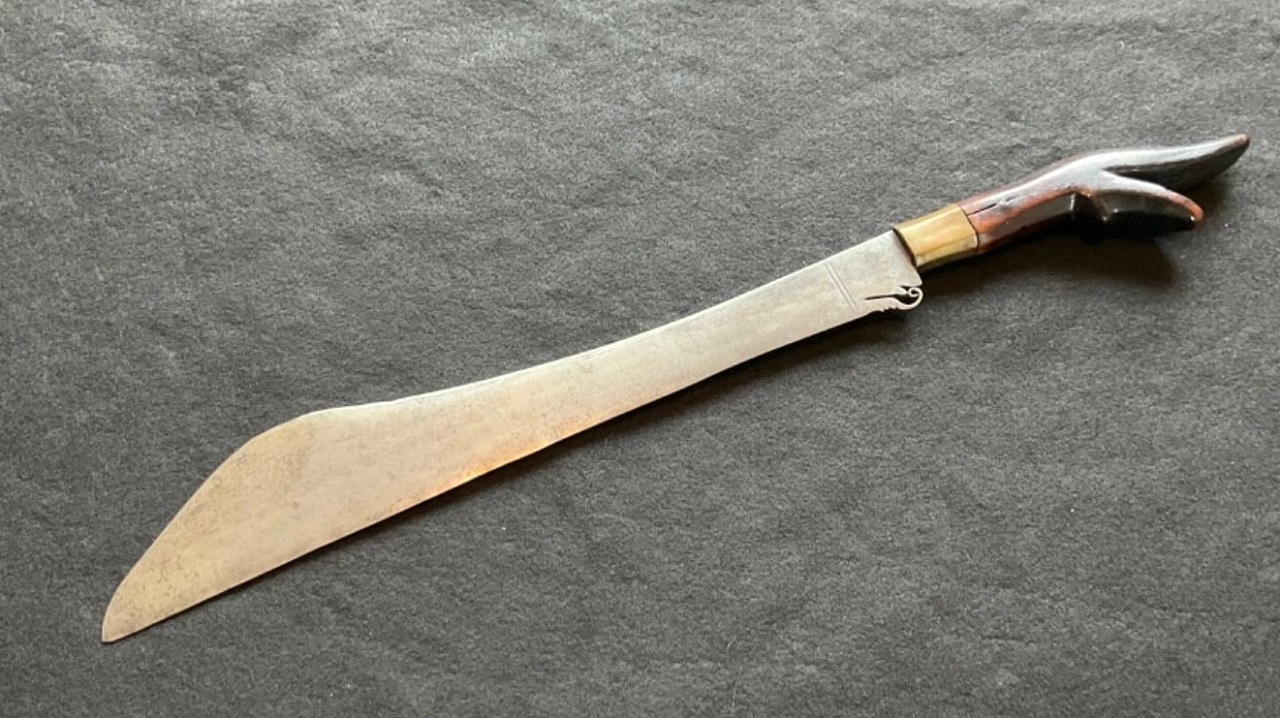 Here is mine which resembles the one Miguel posted. I have had it for several years but still not been able to figure out from where it is. I agree that it looks Filipino in several ways but the elephant trunk makes me suspect it to be Sumatran. But then the rest of the blade form is maybe more like the North Peninsular Malay klewang? The hilt, without the rest of the blade features, could be Moluccan. My guess is still Sumatra or Malaysia but I do hope somebody solves this riddle. Michael PS A hint? I found mine in Holland. I assume Maurice did too? And where was the one Miguel posted found? |