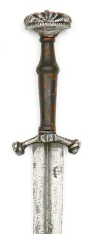 There finally seems to be a fresh breeze in the A&A market. This particular item was sold at auction by Bonhams, Knightsbridge, UK, 29 Apr 2010. The shape of its writhen pommel in the Italian Renaissance manner closely correponds to the contemporary kalzbalgers, hand-and-a-half swords and two-handed swords. The writhen ornament is also characteristic of almost all period items of everyday use including costume and body armor. The mark is hitherto unknown but could be interpreted as an early form respectively a predecessor of the South German/Austrian sickle marks known from many mid to late 16th century blades. Please see a number of earlier profusely illustrated postings concerning this topic by Jim and others here. Enjoy, Michael Last edited by Matchlock; 3rd May 2010 at 12:12 AM. |