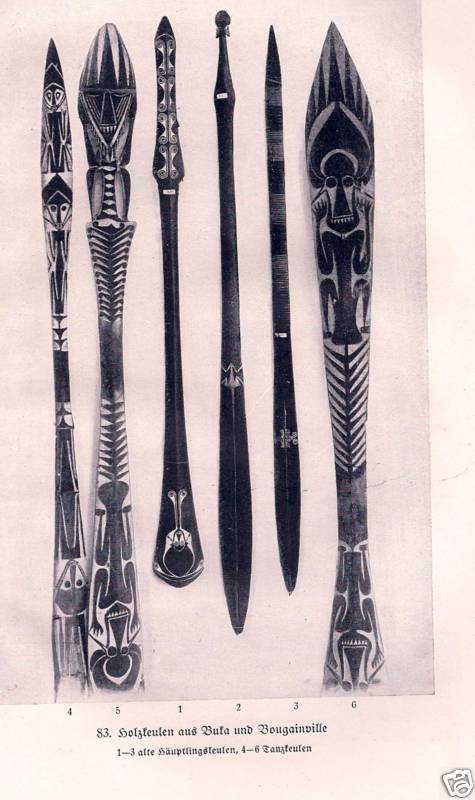 I FINALLY FOUND TIME TO LOOK THRU PARTINGTONS TOME BUT DIDN'T CONFIRM ANYTHING THERE. MY GUT FEELING WAS THE BISMARK ARCHIPELAGO (NEW BRITAN), (NEW IRELAND) OR POSSIBLY NEW GUINEA. THE DESIGN CRUDELY CARVED INTO IT DOSEN'T REALLY FIT WITH ANY OCEANIC DESIGNS, IT SEEMS TO BORROW FROM SEVERAL. IS THE DESIGN NEWER THAN THE CLUB? THAT COULD EXPLAIN A LOT IF IT WAS DONE BY SOMEONE NOT FAMILIAR WITH THE TRADITIONAL DESIGNS OF THE TRIBE SO HE MADE UP HIS OWN. I CONSIDER THIS FORM OF CLUB TO FIT IN THE SWORD STYLE OF CLUB DUE TO ITS SHAPE AND FUNCTION. THE CLOSEST I COULD FIND TO THE SHAPE IN PARTINGTONS WERE 1. PAGE 219 SOLOMON ISLANDS FIG #2, 2. NEW BRITAN PAGE #134 I WILL LOOK THRU SOME OTHER REFRENCES AS TIME PERMITS. NICE AND INTERESTING CLUB. INCLUDED ONE PICTURE OF A SOLOMON IS. CLUB SIMULAR SHAPE BUT WITH THE USUAL SHELL INLAY. ITS THE CLOSEST TO YOURS I HAVE A PICTURE OF BUT YOUR DESIGN IS NOT TYPICAL FOR THE SOLOMONS. ONE PICTURE OF SEVERAL CLUBS FROM THE BISMARK ARCHEPILIGO WITH TRADITIONAL DESIGNS. Last edited by VANDOO; 20th September 2010 at 04:44 AM. |