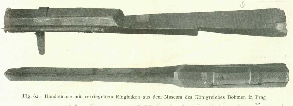 Thanks a whole lot for promoting my threads, my friend! Here is the original, actually existing late 14th century example which your fine reconstruction work illustrated at the end of your latest post is obviously based on. The hook is a modernization of ca. 1430, the earliest date when hooks on guns turned up first as I stated on several earlier occasions. The hole drilled thru the stock was most probably for pivoting on some additional mount. It is preserved in the Firearms Museum of Suhl, Thuringia, and measures about 65 cm overall. It was a find from the attic of a nearby Schloss!!! Best, Michael |