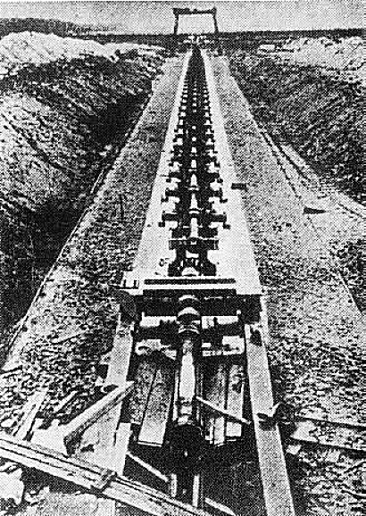 #2. ATLANTIC WALL BATTERY GERMAN WITH CREW #3, #4. & #5. AMERICAN 36 INCH, OR 910 MM. MORTAR TESTED BUT NEVER USED IN COMBAT ONE OF THE LARGEST CALIBER GUNS EVER. SHOWN LAYING DOWN IN LOADING POSITION AND UP IN FIRING POSITION AND WITH PROJECTILE AS IT SITS TODAY. #6. THE RUSSIAN TSAR TANK 1915 FAILED ITS TRIALS AND BOGGED DOWN. #7. & #8. A GERMAN SUPER TANK NAMED THE RATTE IT WAS NEVER PRODUCED EXCEPT AD PLANS AND MODEL;S BUT WOULD HAVE MOUNTED GUNS AS BIG AS THOSE ONLY USED ON BATTLESHIPS. #9. THRU #12. THE GERMAN SUPER GUN HOCKDRUCKPUMPE AKA MILLIPEDE. THEY WERE INTENDED TO BE USED TO BOMBARD LONDON FROM FRANCE BUT WERE NEVER SUCCESSFUL AND THE COMPLEX WAS BOMBED AND DESTROYED BEFORE IT COULD BE USED. THE UNDERGROUND COMPLEX WAS ORIGINALLY PLANNED TO HAVE SETS OF 5 GUNS IN EACH LINE AND UP TO 50 GUNS (SEE DRAWING ). MAXIMUM FIRING RANGE WAS PLANNED TO BE 165 KM. THE BARREL WAS 150 METERS OR 490 FEET LONG AND FIRED A 150 MM FINNED PROJECTILE WEIGHING 310 LBS. WITH A 25 KILO EXPLOSIVE CHARGE. THE PROJECTILE INITIALLY FIRED WITH AN EXPLOSIVE BUT SOLID ROCKET FUEL BOOSTERS FIRED AS IT PASSED EACH JOINT INCREASING ITS VELOCITY. THE BARREL WAS NOT RIFLED TO CAUSE SPIN AND THE PROJECTILES FINS STABILIZED IT IN FLIGHT. #12 IS A PICTURE OF A PROJECTILE |