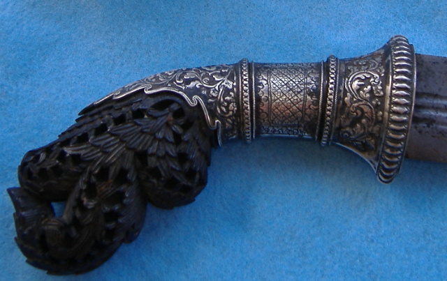I found these two pieces recently. I am attributing them both to Sumatra, though the larger one could have come from any number of places in the Indonesian archipelago, possibly. The other, with the 'long nose' pommel and guard is very specific to one region in Sumatra, but I cannot remember where....hoping VVV can help on this one.