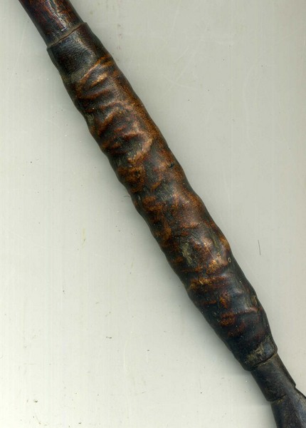 The binding which helps to secure the tang is not typical Zulu in this example , which means either its a replacement binding or perhaps not Zulu but rather from a related ethnic group in S E Africa. Better quality spears have an intricate wire binding with or w/o a sleeve covering made from ox tail hide . In some cases , prestige status symbol spears particularly of the iklwa type belonging to chiefs are wholly covered in wire binding even to the typical swollen butt end. I attach some examples from my own collection |