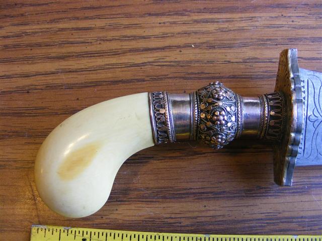 The hilt I believe is ivory with what I believe to be swasa fittings while the guard is a combination of an engraved gold plated copper plate and an engraved silver plated copper plate. The scabbard is covered in decorative gold plated copper sheets and bands. Total length of the dagger itself is 12-7/8 inches with a 7-1/4 inch engraved laminated blade. My thanks in advance for any comments or information that anyone would like to offer.