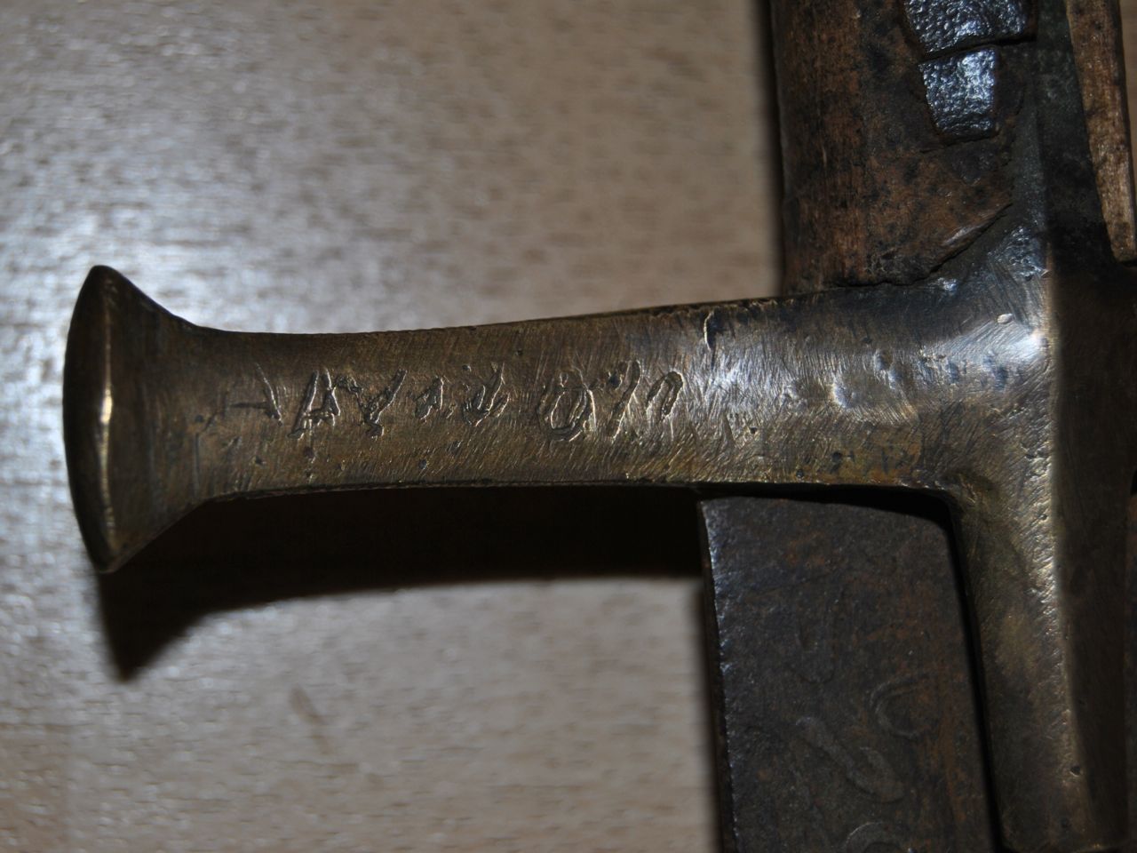 What do you think of this Mahdist Kaskara (42 ") , its rigid blade is engraved with Tuluth characteres, I wonder about the inscription of the guard. On one side is engraved: