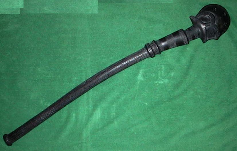 A MORE COMMON FORM IS THE ROOTSTOCK CLUB THEY SEEM TO FALL INTO TWO BASIC FORMS. 1. A SHORT LARGE HEAD WITH WELL TRIMED ROOTS RESEMBLING A FLANGED MACE. 2. A LONGER FORM OF HEAD THAT TAPERS TOWARD THE TIP. BOTH FORMS ARE LEFT WITH KNOBS FOR STRIKING AND SOME HAVE IVORY INLAYS. SOME OF THE LONGER HEADED FORMS MAY BE CARVED TO RESEMBLE A PIECE OF CHAIN OR WHAT LOOKS LIKE AN OCTOPUS TENTACLE, BUT WHEN THIS DONE ARE NO LONGER A ROOTSTOCK FORM. THESE CLUBS ARE USUALLY AROUND 3.5 TO 4 FEET LONG.