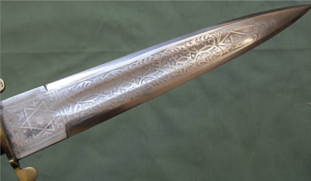 Sorry Gentlemen (David R & NovelsRus) you are agreed on the fact that the scrollwork and lettering are very similar to that found on several, Indian daggers and sabers but you seems have ignored that, also, it's concerning Syrian daggers from Golan Mountains; the "Magdali" David has mentioned that; "star symbol very like the Wilkinson sword quality mark" ... YES but before, long time before Wilkinson this symbol was- Salomon seal, for Yiddish - Soliman seal, for Muslims it's a "TALISMANIC" mark ... before a "quality mark" it's supposed, to banish the bad eye, far away from his possessor here, some pics about "Magdali", for "Soliman seal" I have some Islamic talismanic bowls engraved with some time, on both side (inside/outside), and are Ottomans, have been presented here for me this dagger, could be Syrian, 20th century ... modern version for "Magdali" all the best à + Dom |