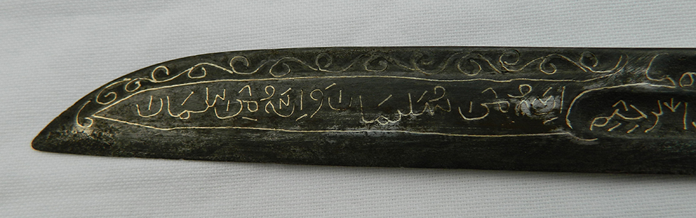It has great patina and a very attractive blade, full of Quran verses and other decorations, inlaid in silver at both sides and the spine.
