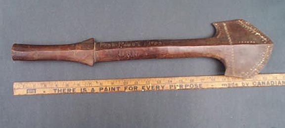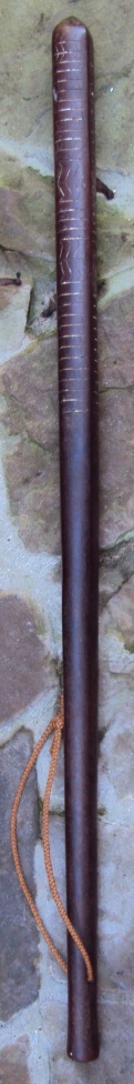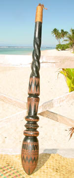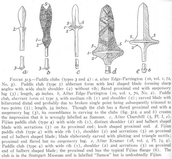 THE ISLANDS OF SAMOA LIKE THE FIJI ISLANDS HAVE QUITE A LOT OF INFLUENCE FROM TONGA BUT LIKE FIJI HAVE THEIR OWN UNIQUE DESIGNS AS WELL. MANY CLUB FORMS ORIGINATED FROM THE SAME NATURAL SHAPES THE MOST PREVELENT BASIC FORM IS FROM THE COCONUT LEAF STALK, IN SAMOA THIS FORM OF CLUB IS CALLED ( LAPALAPA ). THEY ARE CARVED USING AN ADZ. CUTTING FROM THE CENTER LINE TO THE EDGES WHICH FORMS 4 ANGLED FLAT SURFACES WITH A THICKER RIB IN THE MIDDLE AND EDGES TO THE SIDES. THE STRIKING END OF THE CLUB IS WIDE AND TAPERS TO THE SMALLER ROUND GRIP. THIS COPIES THE COCONUT LEAF STALK, IF THE COCONUT LEAF WERE MADE OF HEAVY WOOD THEY COULD HAVE BEEN CONVERTED DIRECTLY INTO CLUBS. PERHAPS THE LEAF STALKS MAY HAVE BEEN USED FOR CLUB PRACTICE AS NOT MUCH HARM WOULD COME FROM SPARING WITH THEM.