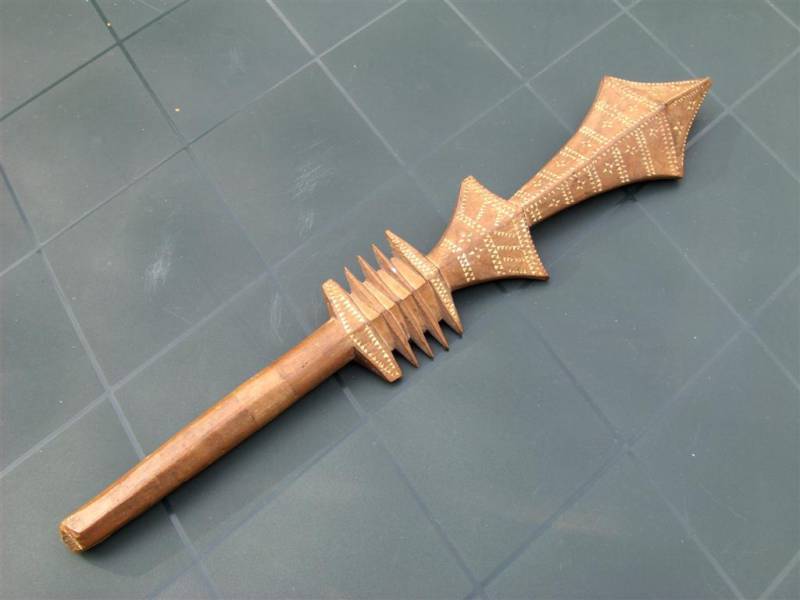 THE ISLANDS OF SAMOA LIKE THE FIJI ISLANDS HAVE QUITE A LOT OF INFLUENCE FROM TONGA BUT LIKE FIJI HAVE THEIR OWN UNIQUE DESIGNS AS WELL. MANY CLUB FORMS ORIGINATED FROM THE SAME NATURAL SHAPES THE MOST PREVELENT BASIC FORM IS FROM THE COCONUT LEAF STALK, IN SAMOA THIS FORM OF CLUB IS CALLED ( LAPALAPA ). THEY ARE CARVED USING AN ADZ. CUTTING FROM THE CENTER LINE TO THE EDGES WHICH FORMS 4 ANGLED FLAT SURFACES WITH A THICKER RIB IN THE MIDDLE AND EDGES TO THE SIDES. THE STRIKING END OF THE CLUB IS WIDE AND TAPERS TO THE SMALLER ROUND GRIP. THIS COPIES THE COCONUT LEAF STALK, IF THE COCONUT LEAF WERE MADE OF HEAVY WOOD THEY COULD HAVE BEEN CONVERTED DIRECTLY INTO CLUBS. PERHAPS THE LEAF STALKS MAY HAVE BEEN USED FOR CLUB PRACTICE AS NOT MUCH HARM WOULD COME FROM SPARING WITH THEM. THE LAPALAPA'S EARLY FORMS WERE LIKELY QUITE SIMPLE AND SOME HAD BRAIDED SENNIT BANDS IN GROUPS OF 3 TURNS FORMING RINGS ON THE CLUBS STRIKING END. LATER THESE CORD BANDS WERE REPLACED WITH CARVED WOOD RIDGES THAT "MAY " HAVE LEAD TO THE ADDING OF TEETH TO SAMOAN CLUBS. WHEN THESE RIDGES EXTEND BEYOND THE CLUBS STRIKING EDGES CONCENTRATING POWER TO A SMALLER AREA. THE BUTT END (HANDLE/ GRIP) ON SAMOAN CLUBS FLARES OUT BUT DOES NOT HAVE A FLANGE AS FOUND ON SOME FIJI OR TONGAN CLUBS. THERE IS OFTEN A LUG WITH A HOLE FOR A CORD ON THE BUTT OF SOME FORMS OF SAMOAN CLUBS BUT IT IS ABSENT ON SOME FORMS AS WELL. 1. PICTURE SHOWING COCONUT TREE AND LEAF AND PARTS THERE OF. 2. PICTURE SHOWING PLAIN LAPULAPU AND VARIATIONS EVOLVING FROM THE SIMPLE ORIGINAL FORM. 3 & 4 & 8 A OLD STONE CARVED EXAMPLE HEAVY TONGAN INFLUENCE.44 X5 INCHES FIGURE 8 SHOWS TOP EDGE. 5. 29.25 INCH EXAMPLE WITH A FORKED END 6 & 7. 37 INCH MODERN EXAMPLE, SAMOA 9. 26 X 2.5 IN. VARIATION OF LAPULAPU 10. A PICTURE OF AN EXAMPLE BROUGHT BACK BY CAPTIAN COOK. 11. SAMOA WARRIOR WITH LAPULAPU CLUB 12. ANOTHER PAGE OF VARIATIONS OF LAPULAPU Last edited by VANDOO; 24th September 2013 at 05:47 PM. |