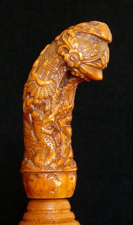 I agree that this hilt is difficult to classify because of its peculiar design, it is probably a quite recent piece but I am not sure, any opinion about the iconography? The second one has a purely floral design, and the third one made from antler? shows eagles and fighting monkeys which are difficult to clearly see on the pictures. And attached are 2 rare specimens of topi style hilts. Regards |