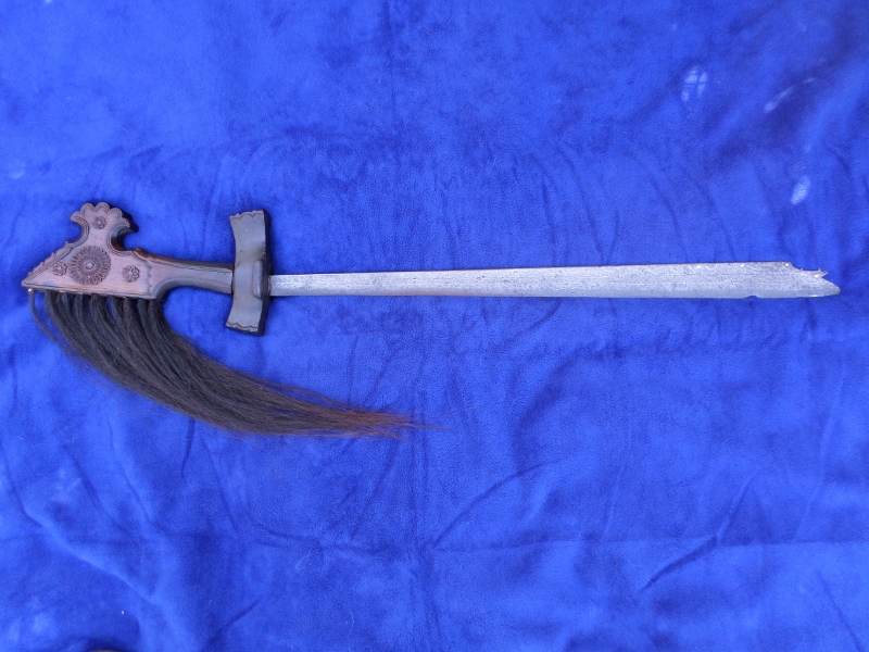 Here is a campilon with what appears to be a twist-core. This is a very old blade, probably the oldest that I have run across. It has a lot of staining, pitting and some edge damage in one spot. Because of this the pattern is not easily seen. Blade is 30 inches long. I can't remember what this handle type is called, only that it is a rare kind. When this blade was new, it was probably pretty impressive. Iv'e had this camp for many years, and just yesterday I decided to clean it up and etch it. imagine my surprise!!!!!!.....Dave.