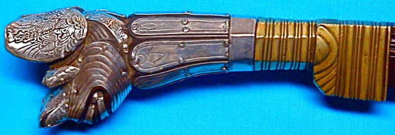 Jose, What a rare and wonderful find !!! I have never seen another exactly like this before though I have seen one other Philippine chopper with the exact same blade shape only minus the fullers but it was fitted with a much planer hilt. Excellent restoration work as usual. I do see that the small retaining plate where the tang extends through the hilt is still missing. Do you think that it would have been made of silver to match the rest of the more decorative bits, or possibly steel or brass for more strength? Could you possibly post the dimensions of this piece for future reference. My sincere congratulations to you on not only having the good fortune in finding such a rare piece, but also on the great restoration work that you have done to preserve it for later generations to admire.