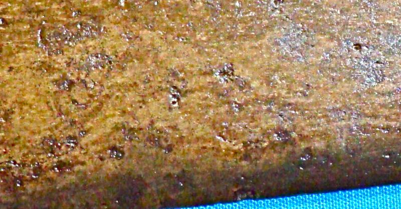 I got this little beauty a while back. Confirmation from Nacho and Migueldiaz, I believe this to be a ba'id, a "chopper" from Bicol. It is dated "1735 AD" on the ferrule with dark patina inside the engraved date upon deep magnification. As far as I know, we have not seen a piece this early. The hilt is made of carved horn with the tang going through the hilt (see pictures). The quality ferrule is brass, and the mounts are silver with silver nails. I believe the pommel to be a form of aso, a dog/dragon. You can see the shape of the blade. Engravings are on one side only, and there are 2 grooves on top, ending with a bird and flower. There is a lot of pitting on the blade, especially on the back, but you can still see laminations in the blade. In fact, the distill end of the blade where it is concave, it looks like to me that there is an inner core of steel surrounded by other steel. These first pictures are as I got it, half of the silver mounts remaining, and many nails missing. |