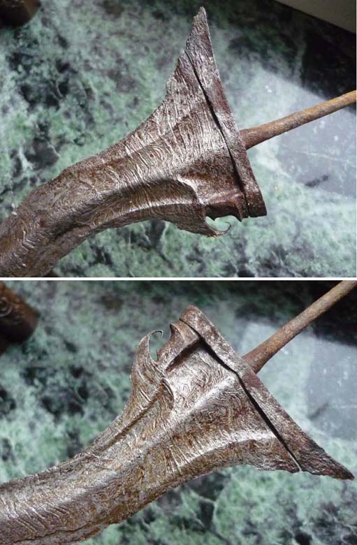 Hope some of you will enlight me about the pamor and dapur of this 3 luk keris. It has been cleaned recently. Both sategal spikes worn so if not a Pudak sategal then a Jangkung Mangkurat is feasable? The rendering of pamor Kupu Tarung shows a close resemblance with mine. There is a alternating motif all the way to the tip ( still there but slanted). Thanks for watching and comments.... |