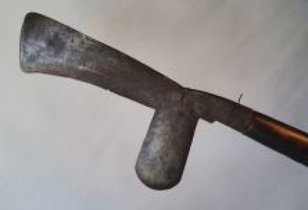 THE FERRULE AND THE IRON STRAP AROUND THE BUTT OF THE HANDLE ARE FORGED BUT ROUND. THE WOOD SHAFT IS SOMEWHAT IRREGULAR BUT BASICALLY ROUND. IT IS TAPERED DOWN SMALL AT THE BUTT AND THE GRIP IS CLOSER TO THE HEAD WHERE THE GRIP AND BALANCE IS RIGHT, IT WOULD BE GOOD FOR FIGHTING UP CLOSE BUT DOSEN'T ADD MUCH TO YOUR REACH. IT KIND OF LOOKS LIKE A TREE BRANCH WAS USED AND ROUGHED OUT TAPERED AND SMOOTHED LEAVING IT CLOSE TO ITS NATURAL SHAPE NOT TURNED BY MACHINE. THE BLADE IS SHARP ON THE INSIDE CURVE AND AROUND THE ROUNDED AX BLADE AT THE SIDE.