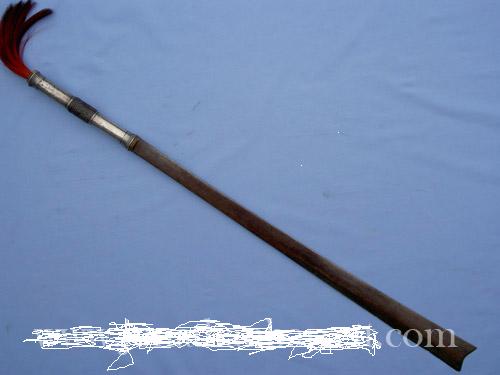 THERE ARE SO MANY DIFFERENT TRIBES, CUSTOMS, LANGUAGES AND VARIATIONS OF WEAPONS IN THE REGION. IT MAKES IT DIFFICULT ESPECIALLY IF YOU HAVE A ITEM THAT FALLS OUTSIDE OF THE NORMS WHICH ARE PICTURED IN THE FEW REFRENCE BOOKS. YOUR SWORD LOOKS A LOT LIKE A BLADE WITH A SHORT TANG SO IT MAY HAVE HAD A DIFFERENT LESS STURDY HANDLE AT SOME TIME. THE GRIP NOW ON THE BLADE WILL BE MORE STURDY BUT MAY BE A MAKSHIFT TEMPORARY REPAIR MADE SO THE SWORD COULD STILL BE USED. OR IT COULD BE A TRUE FORM OF SWORD IN SOME REGION OR TRIBE.
