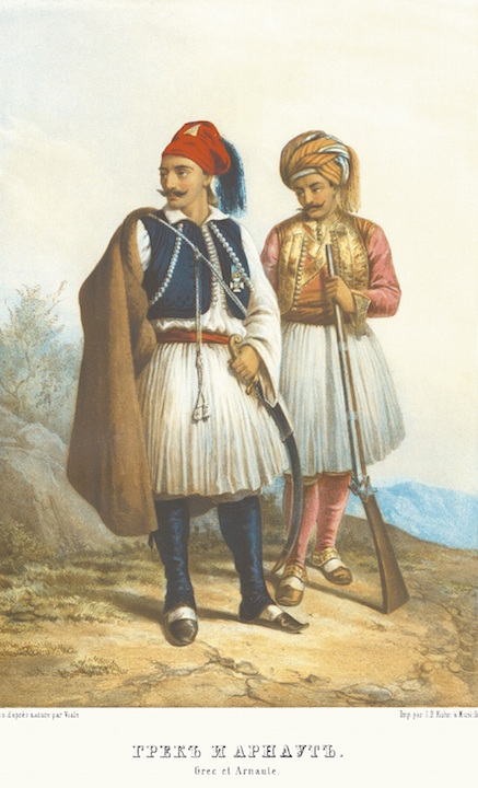 The first one is taken from a painting, Warrior ("Pallikari") of Sellaida (Souli), Greece, by Dupré Louis (1820). The second is an Hellenic Army General in full dress uniform (1835). The third is titled, A Greek and an Arnaut wearing the Fustanella costume, Russia, 1862. Ian. |