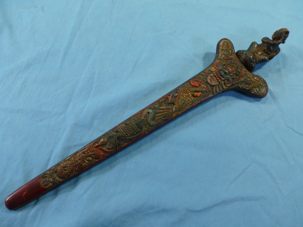 This dagger with colorful with pamor spear shaped blade (May be a secondary use of a spear blade) and keris style carved and colorful hilt and scabbard is Indonesian, early - mid 20C. Blade 11 1/2 inches with a central rib. Total length 17 1/2 inches. Very good condition. Where in Indonesia do you think this was made? If indeed the blade is a repurposed spear, might it not be older? Marcus |
