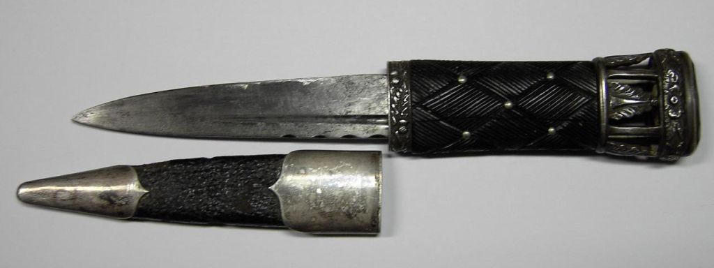 This morning the postman brought me a small package the content of which was very welcome: A Scottish Scean Dhu with a very sharp blade. Grip is ebony and the crown with a orange jewel (?) on top and the other mountings are made of silver. Total length is 205mm, blade is 97mm. Comments are invited.