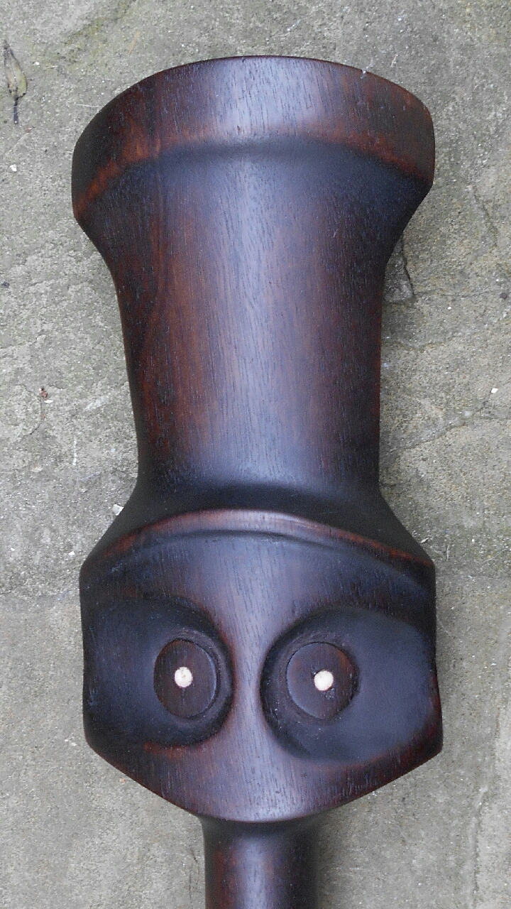 Here now and very nice. Very nice patina perhaps not potentially 300 years old as the one in the Pitt-Rivers. The white dots appear to be bone rather than shell as the brown spots with a x10 indicate. Not really a war weapon. A status symbol which could be used to whack anybody not bending to your will. Shown with some chums one or to stragglers not included.