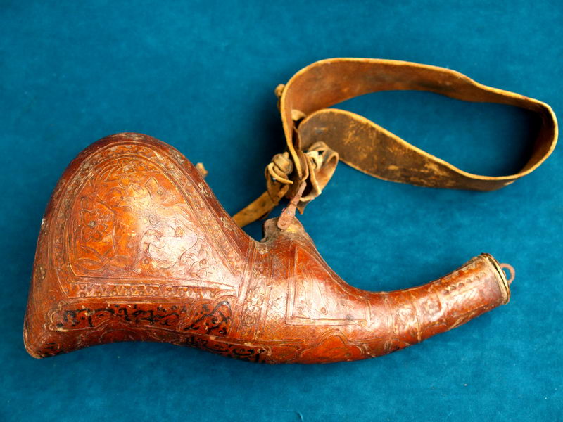 Whilst these powder flasks are often seen for sale, the origin stated has been a little hazy, ranging from Arabia, Persia (Iran) and Afghanistan. Also they are often referred to as made from animal scrota. Fact or fiction???