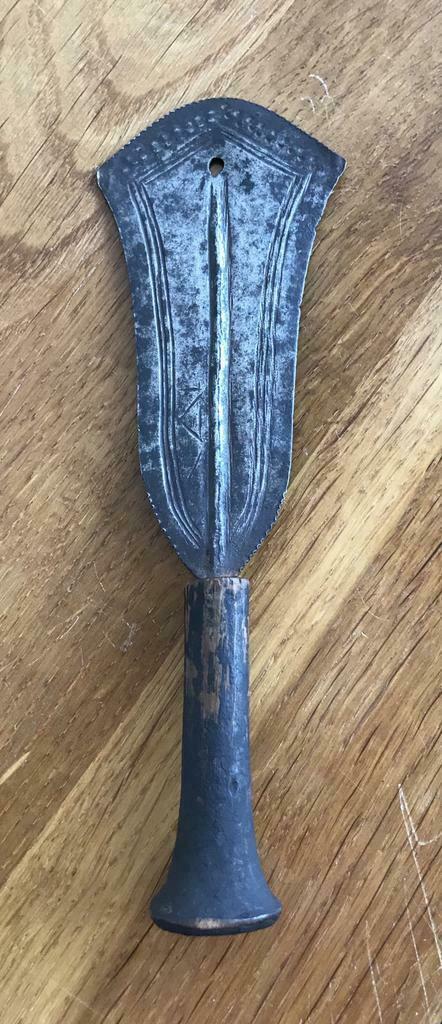 Mine differs from the pictured example by having a very short hilt, with no sign of ever having the heavy, blocky pommel as seen on yours. Mine was described as "Azande" on Artzi's site, and you can see it if you care to search. The blade shape and decorations are quite similar to the photos of the Tetela swords I've seen. I don't know much about the area or the blades, but I was enthralled by the shape of the blade. By the way, my blade is extremely thin and lightweight; it could be used as a weapon, but I'd prefer something heavier for social work. There was a light dusting of red rust on mine, which I attacked with 0000 steel wool soaked in Eezox, applying and wiping clean until he active rust was eliminated. A coat of Renaissance wax was applied to prevent further oxidation. Regarding cleaning, my inclination is to stop active rust, but leave blades as close to the condition in which they were found. My limited understanding is that the decision to clean, and the extent thereof, varies from place to place. While aggressive cleaning might highlight some design factors, and can improve the aesthetics of a weapon, that view is limited by the preferences of the person doing the cleaning, and might well be contrary to the original maker's concept. Less is more, in my opinion, at least until such time as I might have a deeper understanding of the item, and how it fits into its milieu. |